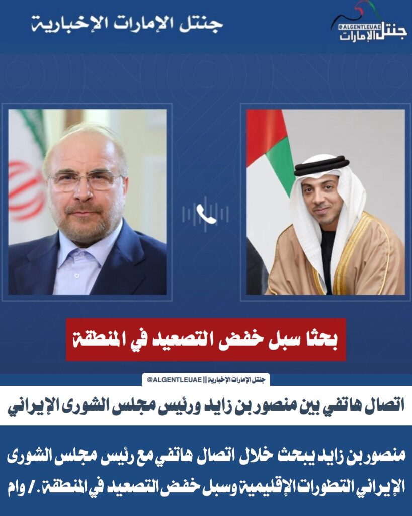 اتصال هاتفي بين منصور بن زايد ورئيس مجلس الشورى الإيراني